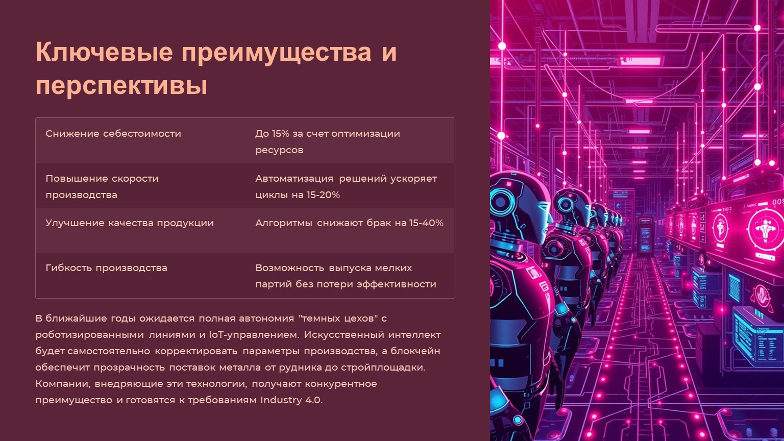 - AI-алгоритмы смогут самостоятельно корректировать параметры производства.