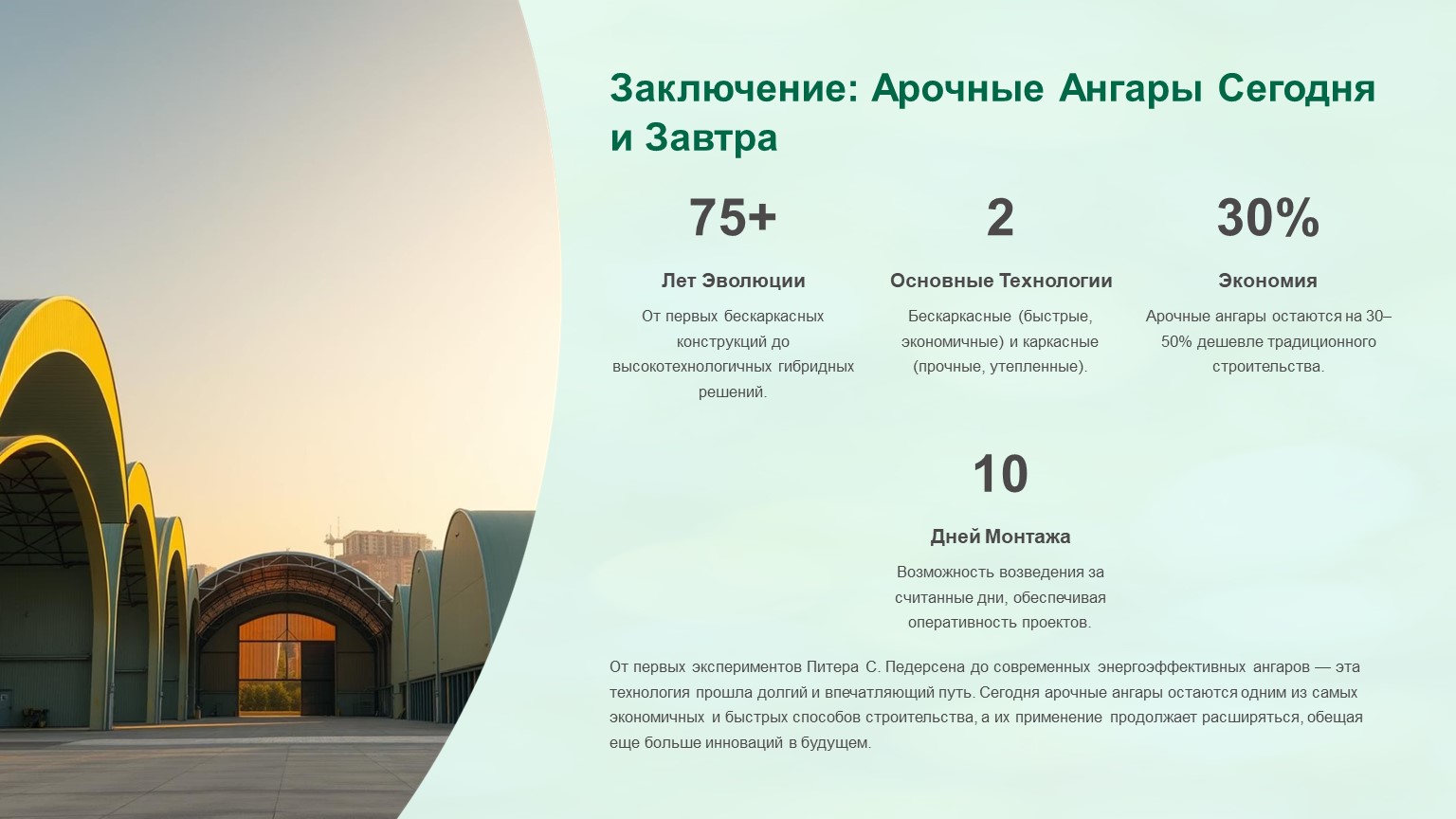 От первых экспериментов Педерсена до современных энергоэффективных ангаров — эта технология прошла долгий путь. Сегодня арочные ангары остаются одним из самых экономичных и быстрых способов строительства, а их применение продолжает расширяться.