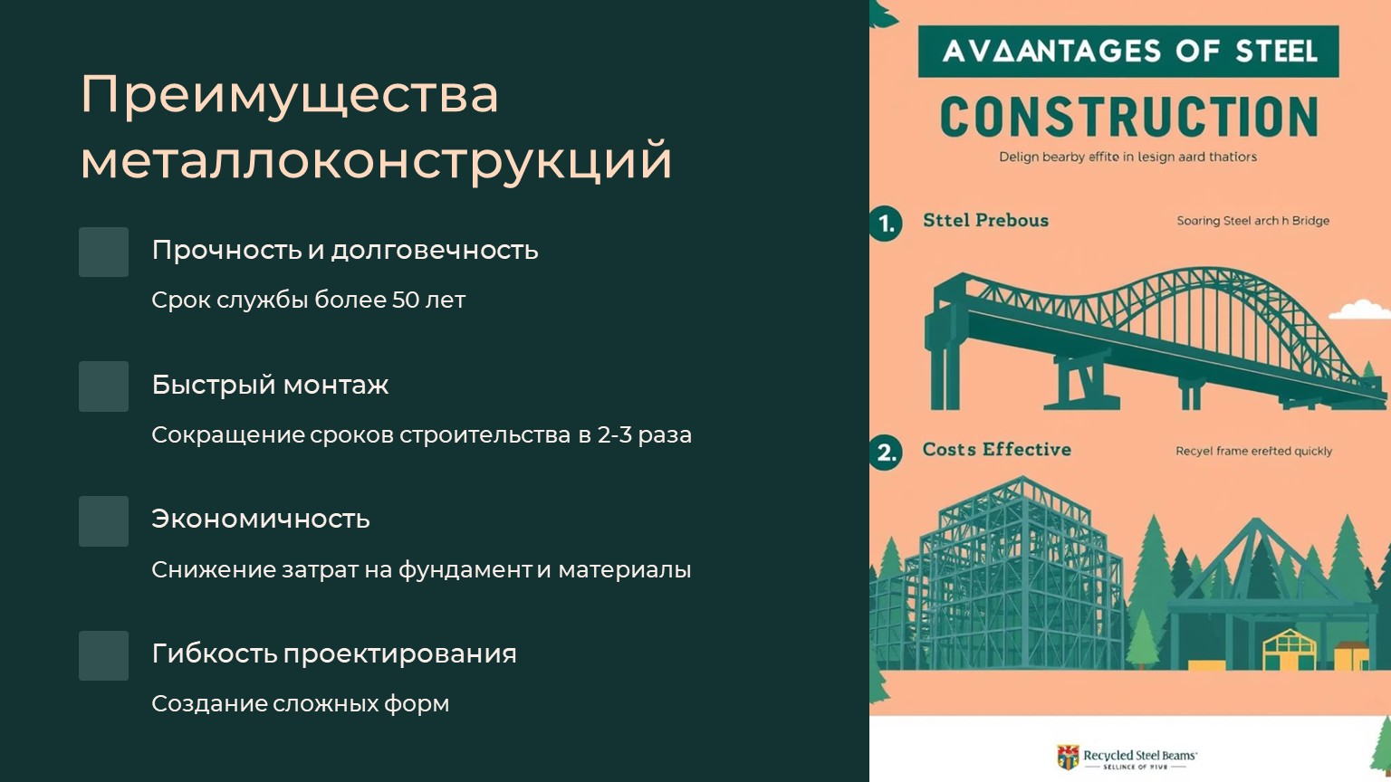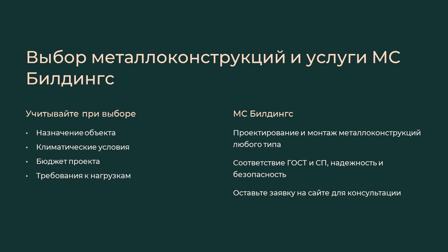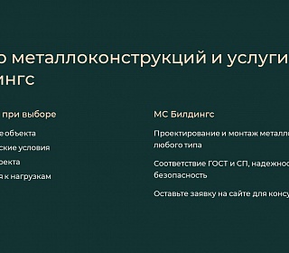 Компания МС Билдингс предлагает проектирование и монтаж металлоконструкций любого типа. Наши решения соответствуют ГОСТ и СП, гарантируя надежность и безопасность объектов.