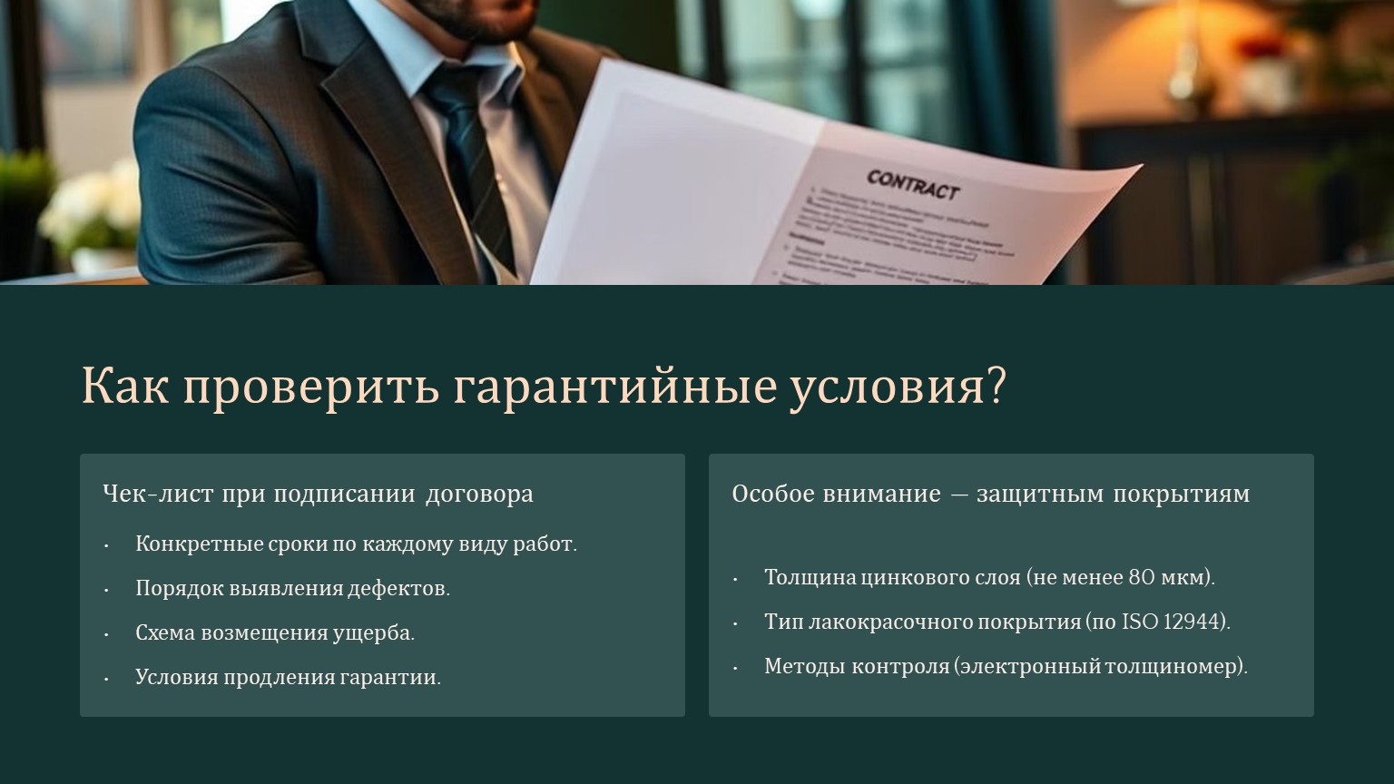 Гарантийные обязательства — важнейший аспект договора на изготовление металлоконструкций, который защищает интересы заказчика. Однако 65% потребителей не проверяют условия гарантии, что приводит к проблемам при выявлении дефектов. В этой статье мы разберем ключевые аспекты гарантийных обязательств и дадим практические рекомендации по их оформлению.