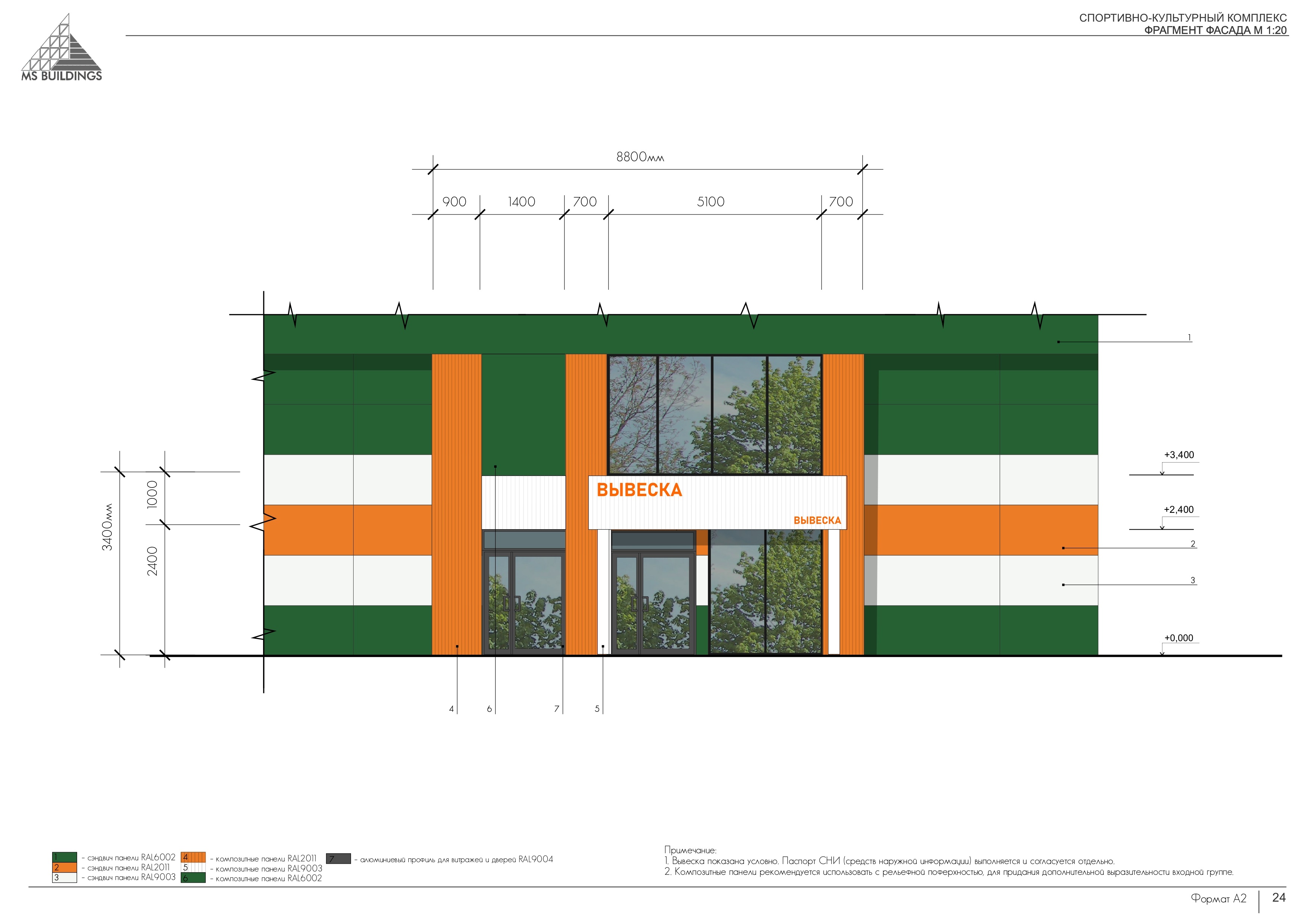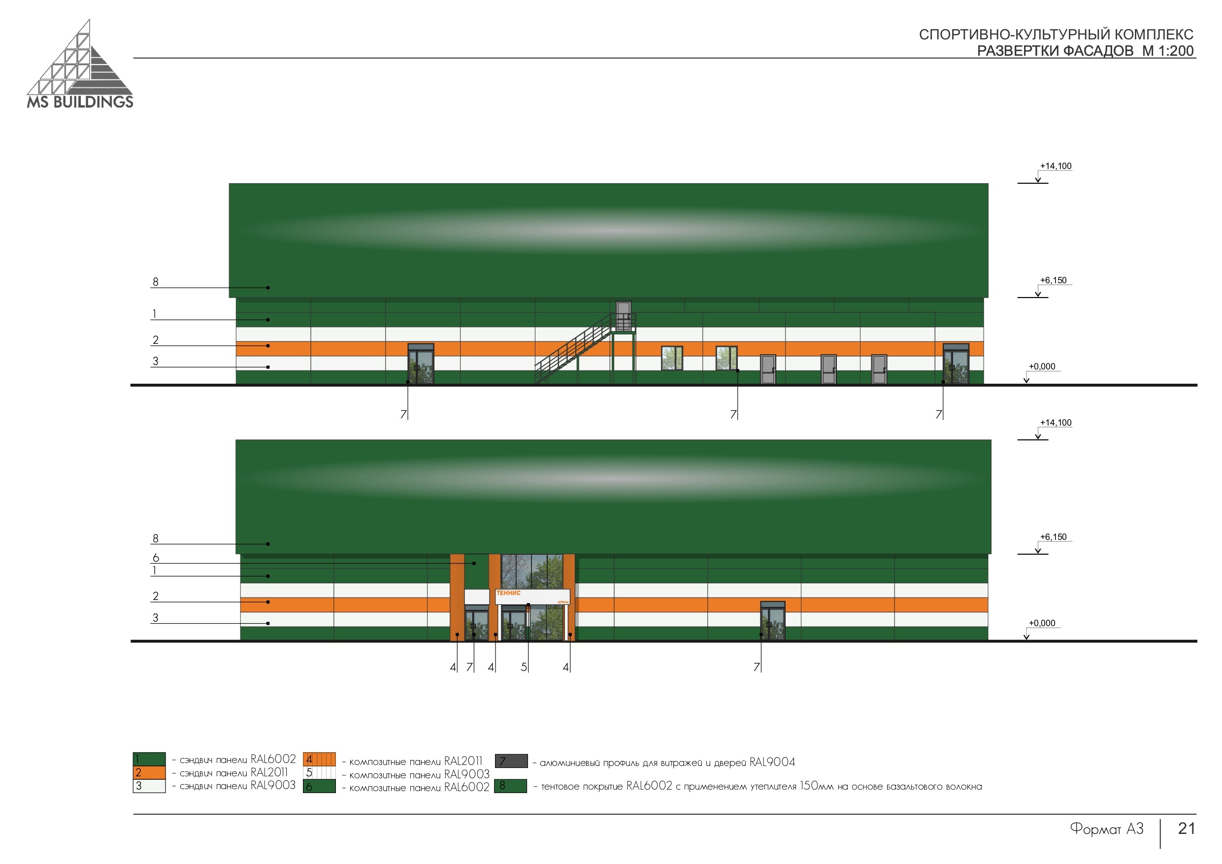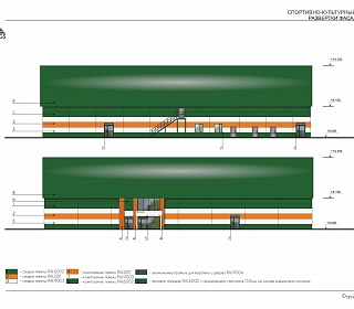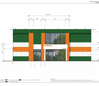 Фасады здания решены в локоничных, соотвествущих функциональному назначению объекта формах. Облицовка сэндвич панели RAL 6002, RAL 2011, RAL 9003 (Техностиль) и ВНФ с облицовкой из композита. Профиль дверей, витражей и окон RAL 9004. Кровля RAL 6002.
