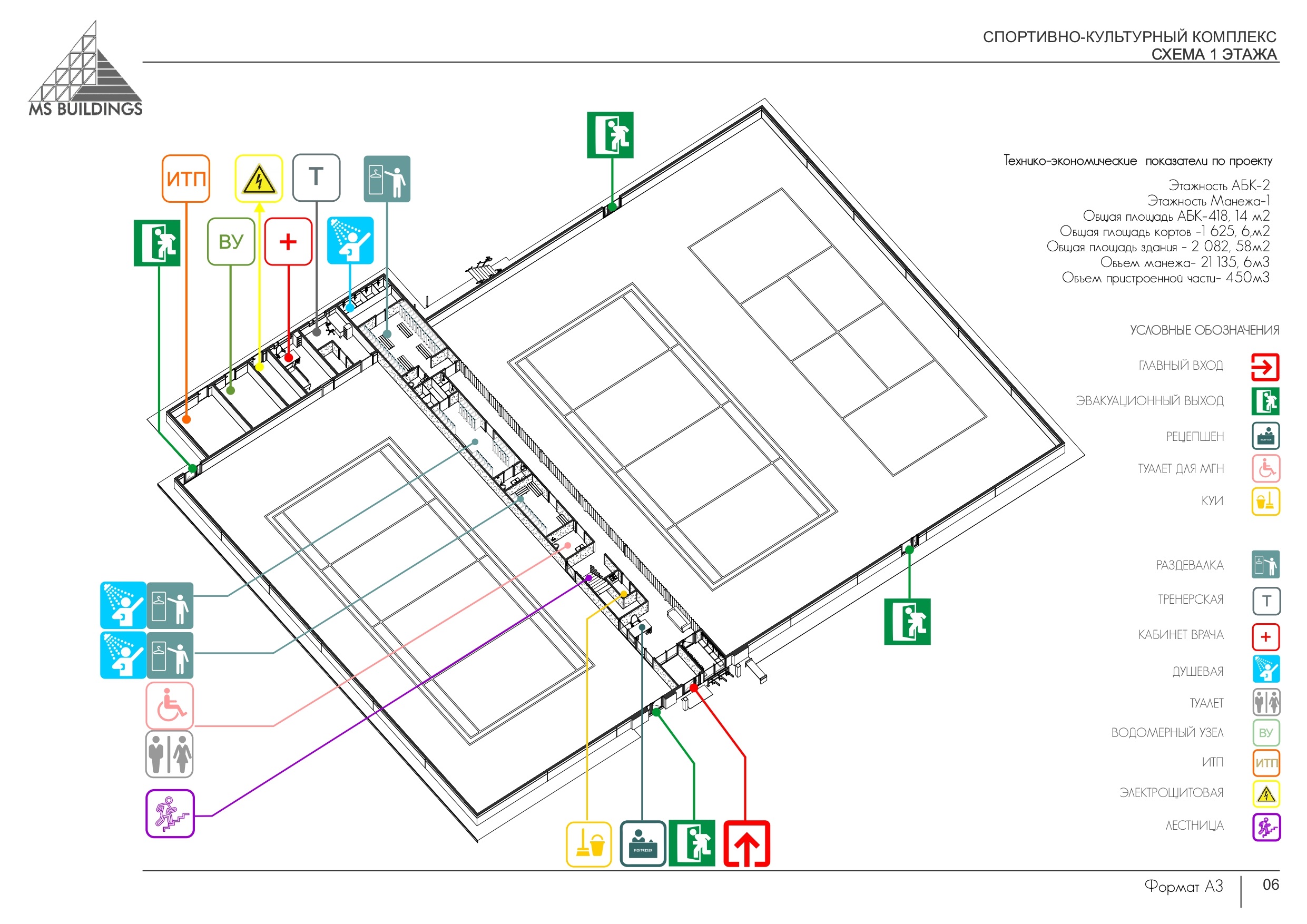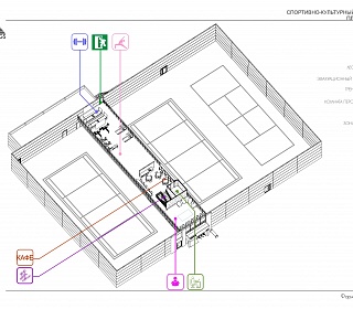 В АБК предусмотрено по две раздевалки для взрослых (мужская и женская)с отдельными душевыми и с/у; одна раздевалка для детей; тренерская с собственной раздевалкой, душевой и с/у; кабинет первой помощи; ресепшен с зоной отдыха; универсальный с/у; КУИ; электрощитовая, тепловой и водомерный узел, итп; на антресоли предусмотрена зона отдыха для посетителей; место приема пищи; помещение для персонала.