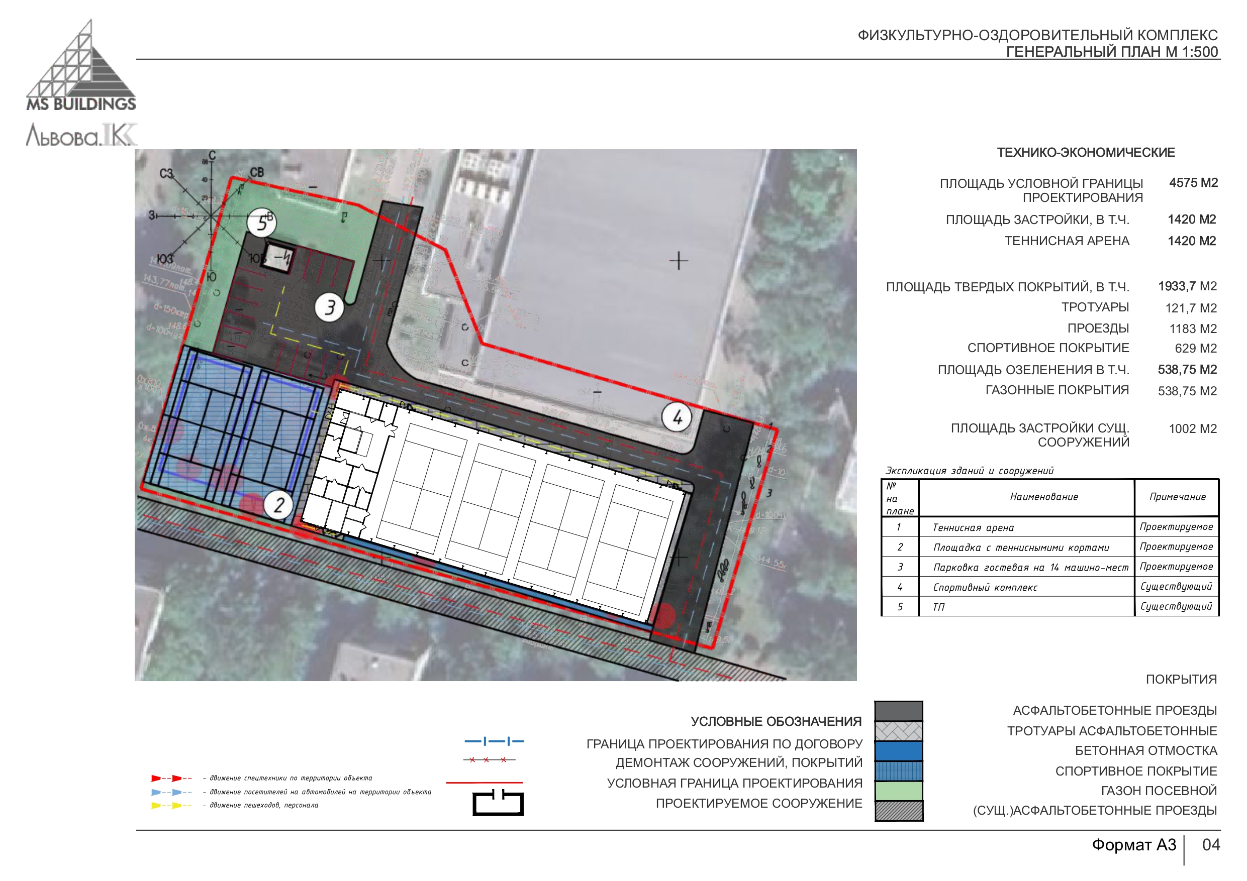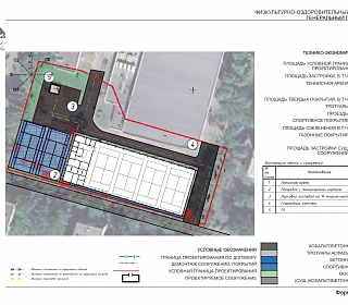 Концепция разработана на установку не капитального спортивного объекта. Место для физкультурно-оздоровительного комплекса располагается на свободном от застройки участке, с умеренным уклоном с отметками от 146.9-149.31