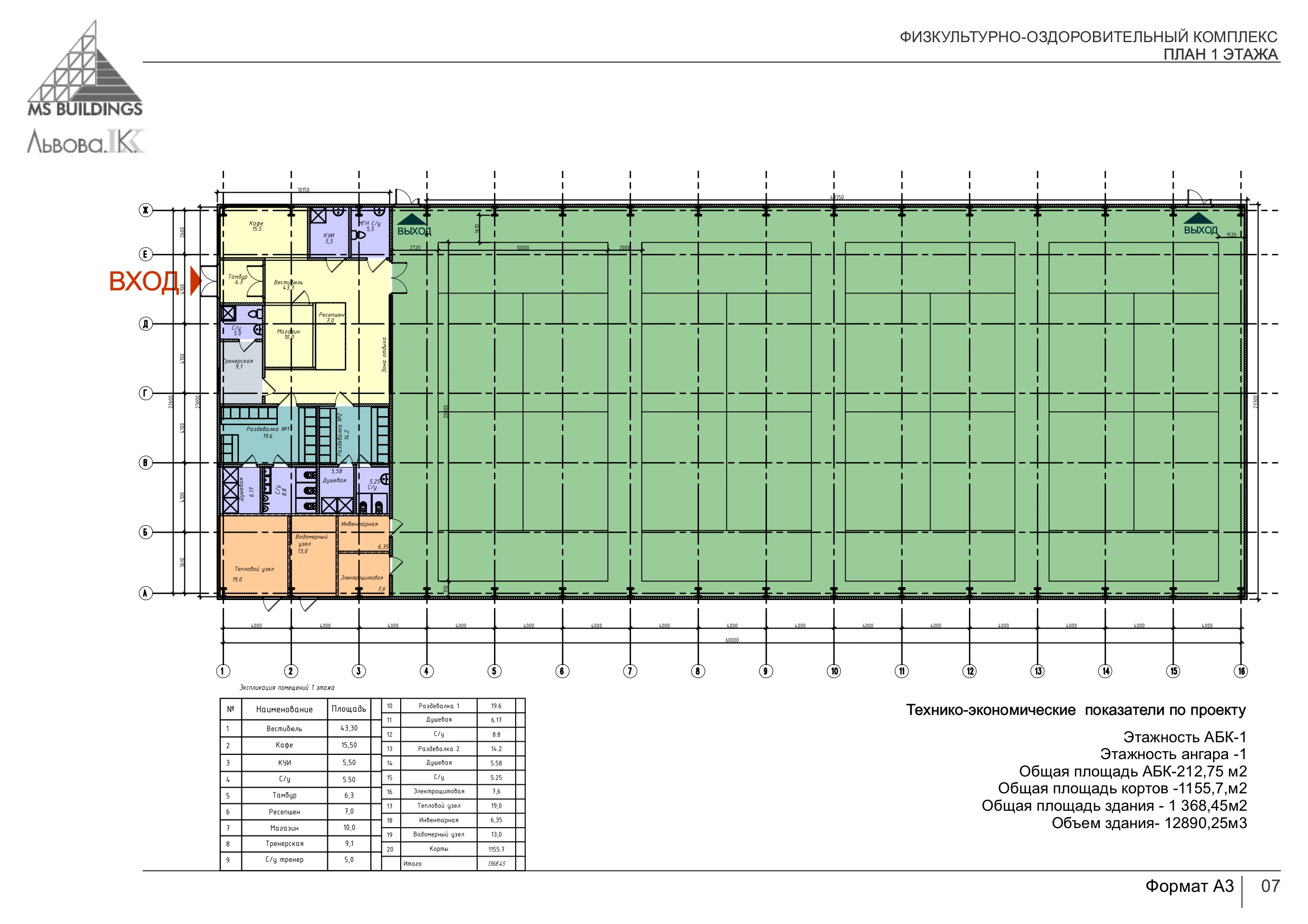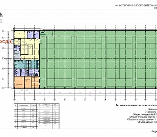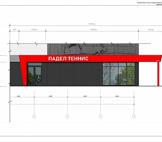 Проектируемое сооружение одноэтажное, состоит из двух функциональных зон: первая- административно-бытовая размерами 22,6х10,15м; вторая-теннисный манеж размерами 22,6х48,5м(сборно-разборного типа конструкций) с четырьмя полями для падел-тенниса размерами 10х20м. Высота здания-10,25м. Открытые площадки (2шт)с искусственным покрытием 10х20м.