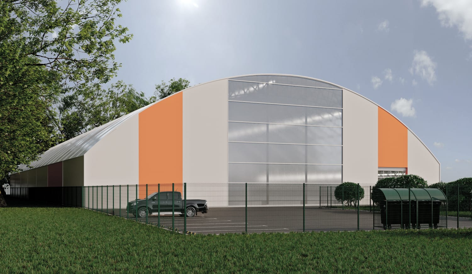 Ограждающие конструкции кровли тентового здания - «Панели тентовые трехслойные с базальтовым утеплителем» (сертификат соответствия №04ИДЮ 13.RU.C00470) которые изготавливаются согласно ТУ 23.99.19-002-45384498-2021, в комбинации с кровельной модульной системой Карбогласс