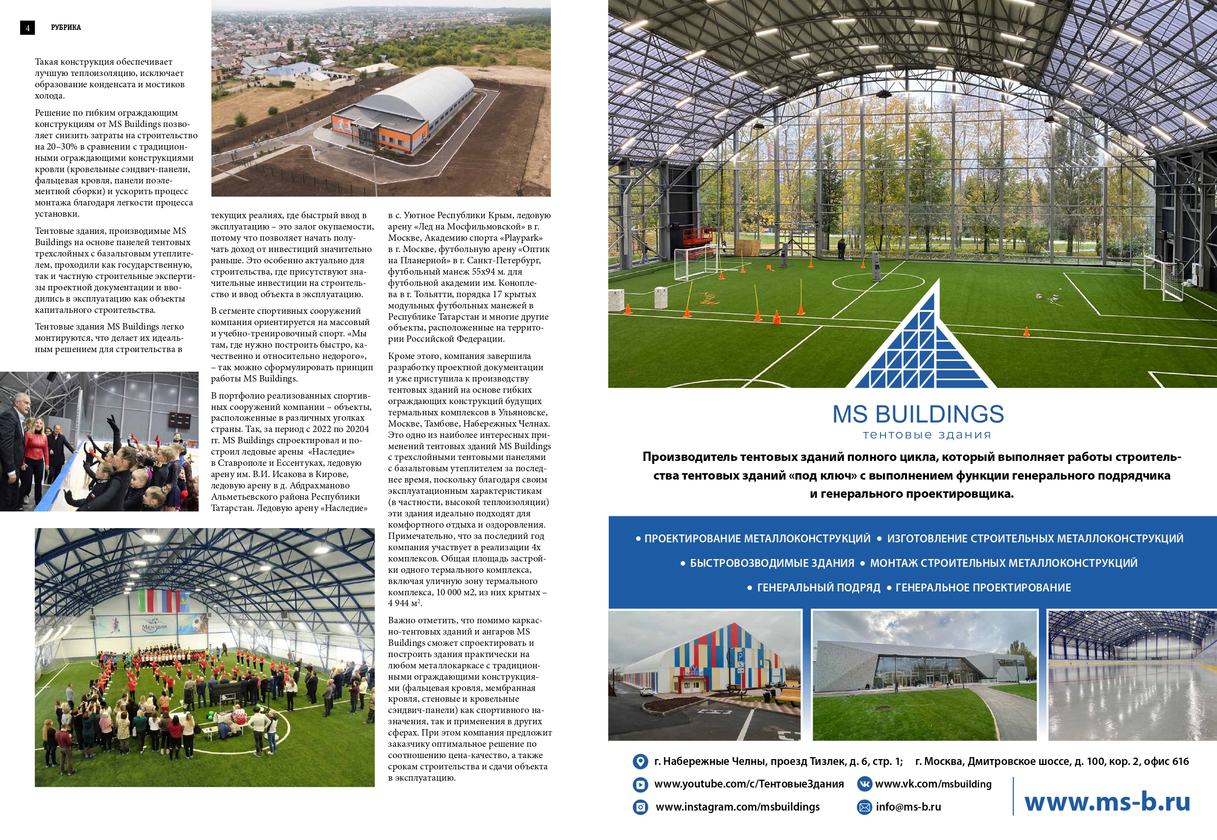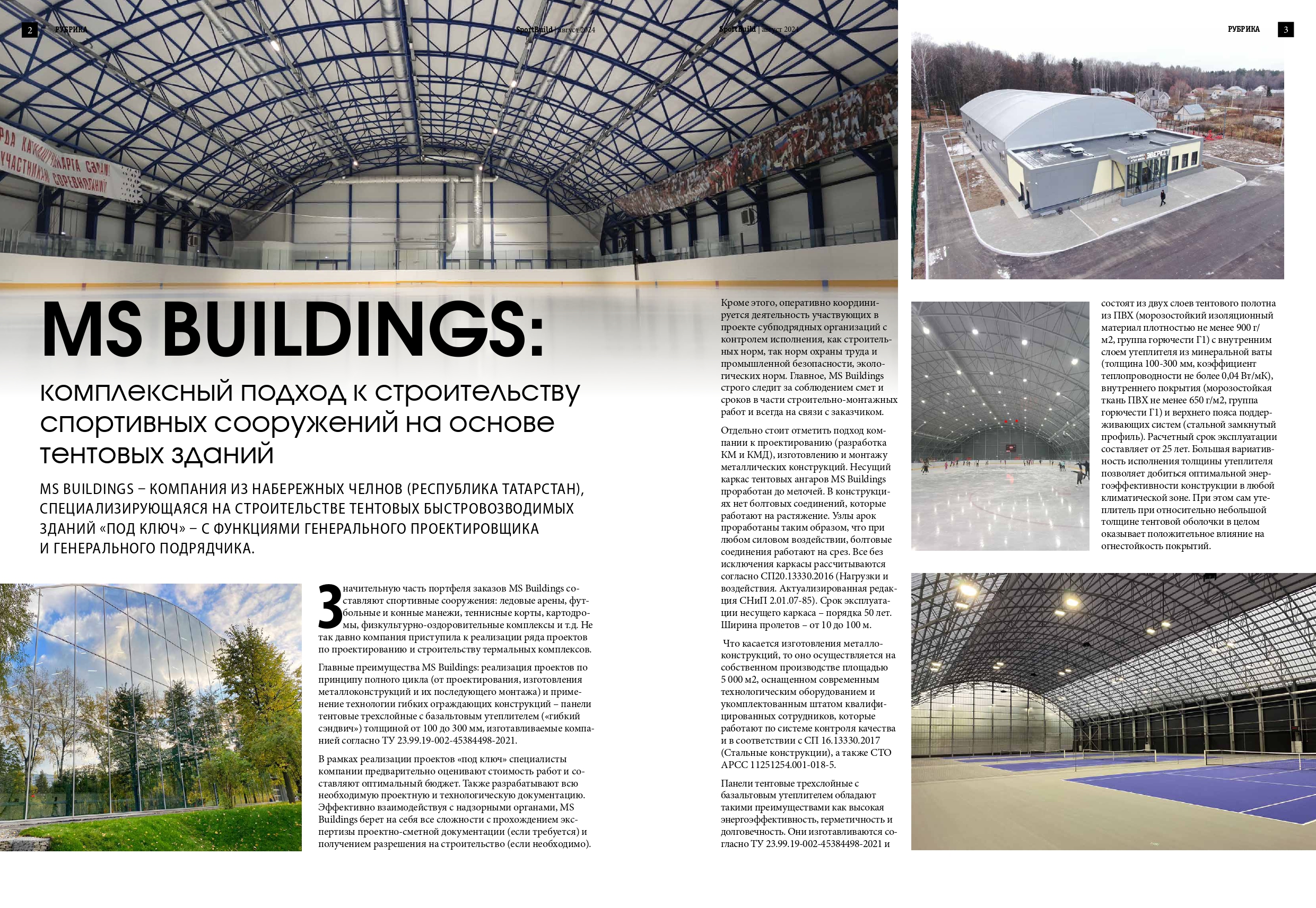 В сентябрьском номере журнала «Sport Build» вышла статья о компании МС Билдингс, под названием «MS BUILDINGS: комплексный подход к строительству спортивных сооружений на основе тентовых зданий».