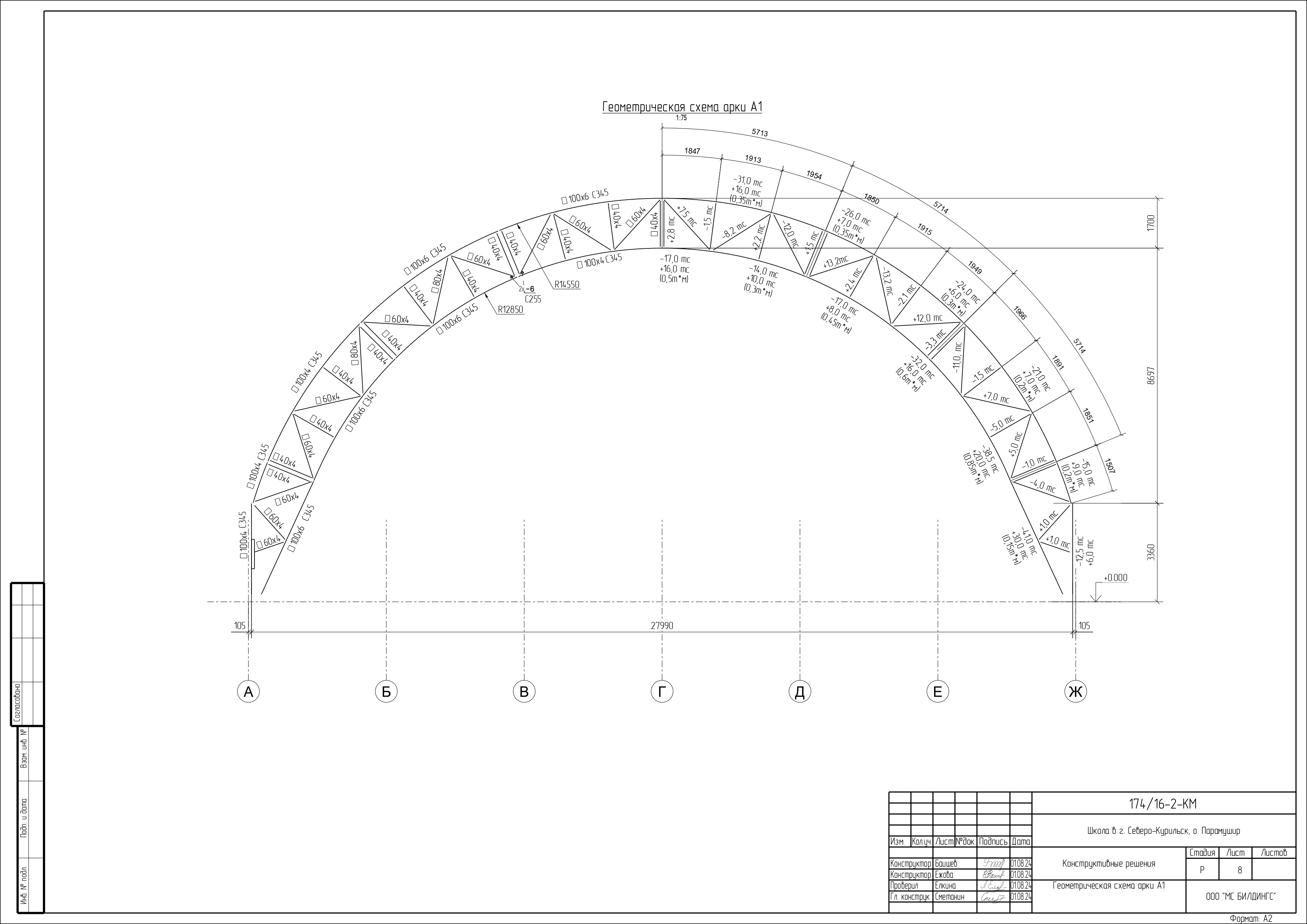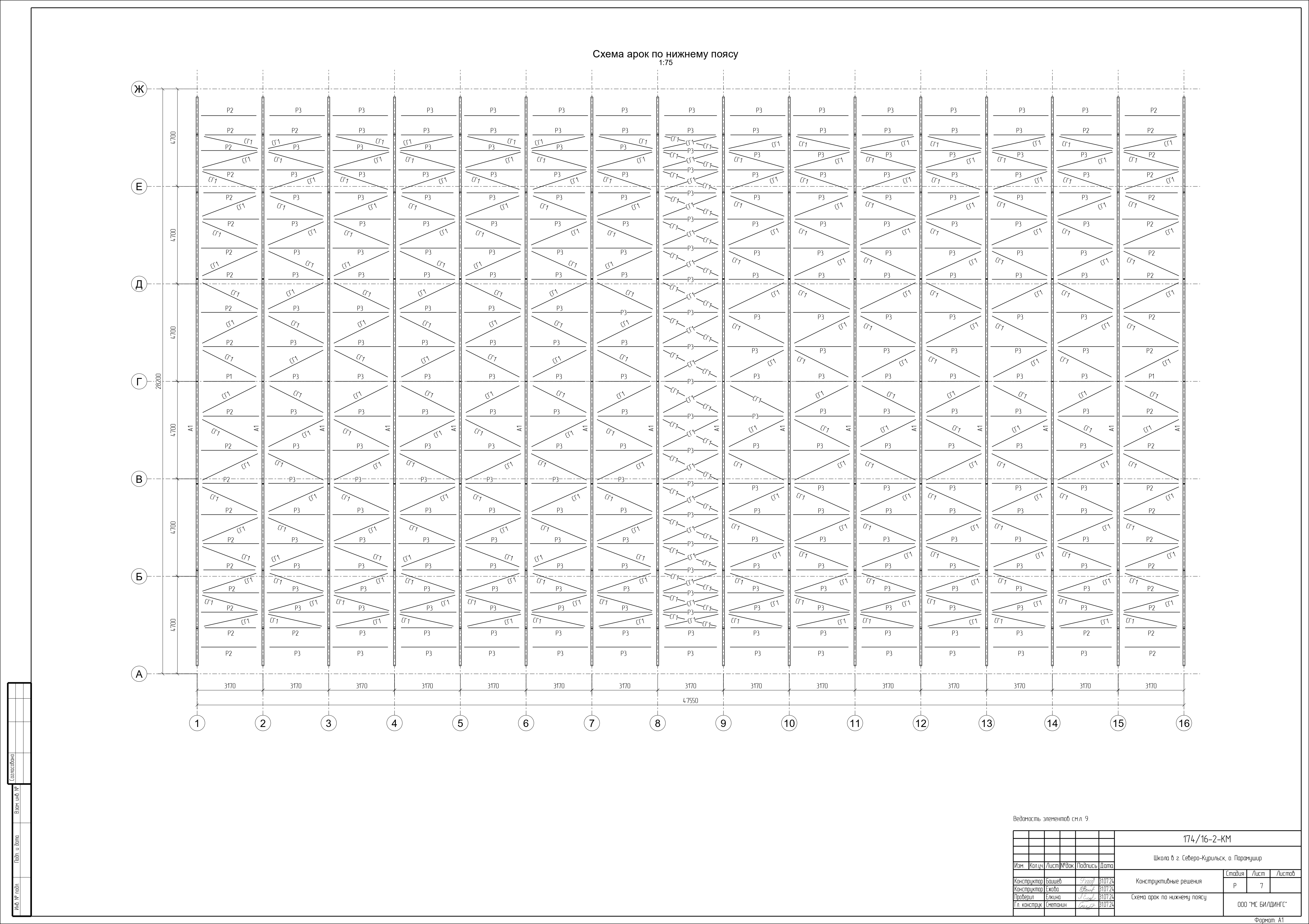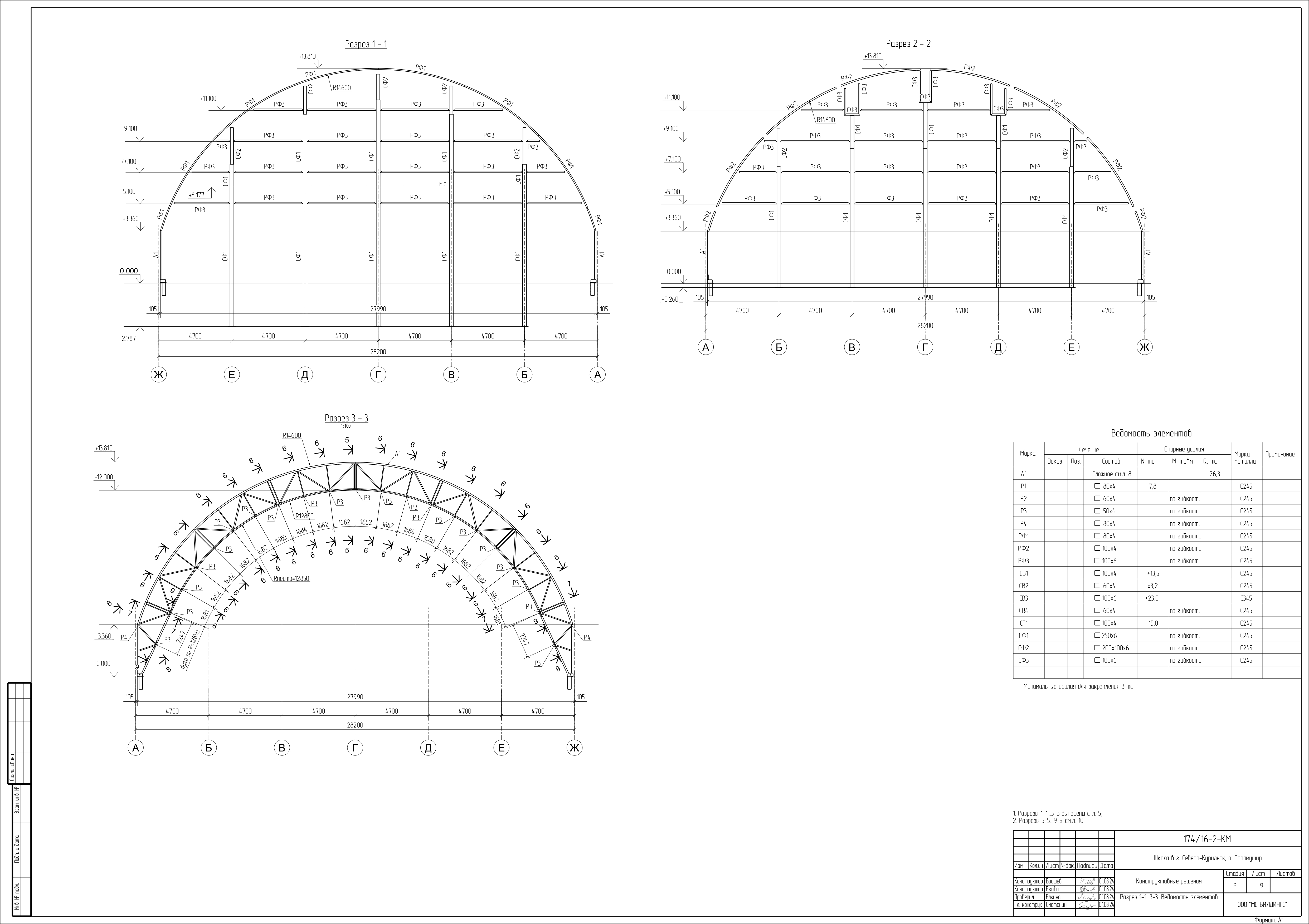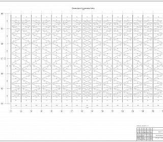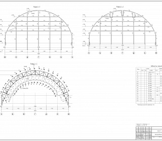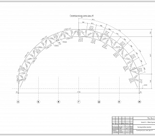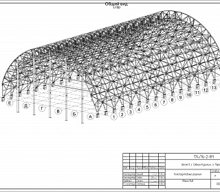 Сборно-разборное тентовое арочное здание расположенное в осях 1-16/А-Ж и имеет размеры по крайним осям 47,5 х 28 м. Отметка верха покрытия 13,8 м. Поперечные рамы однопролетные, шаг расположения 3,17 м, пролет 28 м. Опирание колонн на фундамент - шарнирное. Сопряжения арок и колонн - жесткое. Схема покрытия - беспрогонная. В поперечном направлении общая устойчивость конструкции обеспечивается за счет жесткого сопряжения арок и колонн. Устойчивость арок из плоскости по верхнему поясу обеспечивается связями между верхними и нижними поясами. Устойчивость из плоскости по нижнему поясу обеспечивается системой связей и распорок.