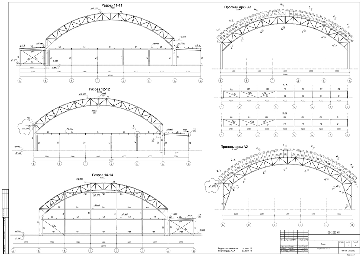 Опирание арок на фундамент - шарнирное. Сопряжение элементов конструкции между собой выполняется из листовой стали. Схема покрытия прогонная. Прогоны разрезные, шарнирно опирающиеся на арки. В поперечном направлении общая устойчивость конструкции обеспечивается за счет жесткого сопряжения арок и колонн. Устойчивость арок из плоскости по верхнему поясу обеспечивается прогонами, связями между прогонами и связями между верхними и нижними поясами.Устойчивость арок по нижним поясам обеспечивается системой вертикальных и горизонтальных связей и распорок.
