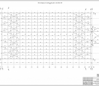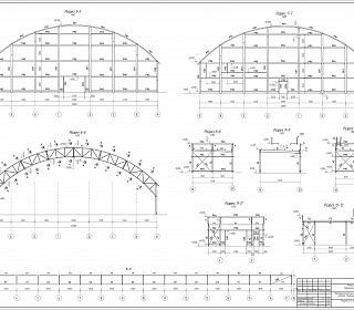 1. Сборно- разборное тентовое арочное здание, расположенное в осях 1/18 / А-И. Размеры по крайним осям 62м х 32м Отметка верха покрытия +12,9м. Поперечные рамы однопролетные, шаг расположения 4,06 м, пролет 32 м. Опирание колонн на фундамент - шарнирное. Сопряжение колонн и арок жесткое. Сопряжение элементов конструкции между собой выполняется из листовой стали. Схема покрытия прогонная. Прогоны разрезные, шарнирно опирающиеся на арки. В поперечном направлении общая устойчивость конструкции обеспечивается за счет жесткого сопряжения арок и колонн . Устойчивость арок из плоскости по верхнему поясу обеспечивается прогонами, связями между прогонами и связями между верхними и нижними поясами. Устойчивость арок по нижним поясам обеспечивается системой вертикальных и горизонтальных связей и распорок.